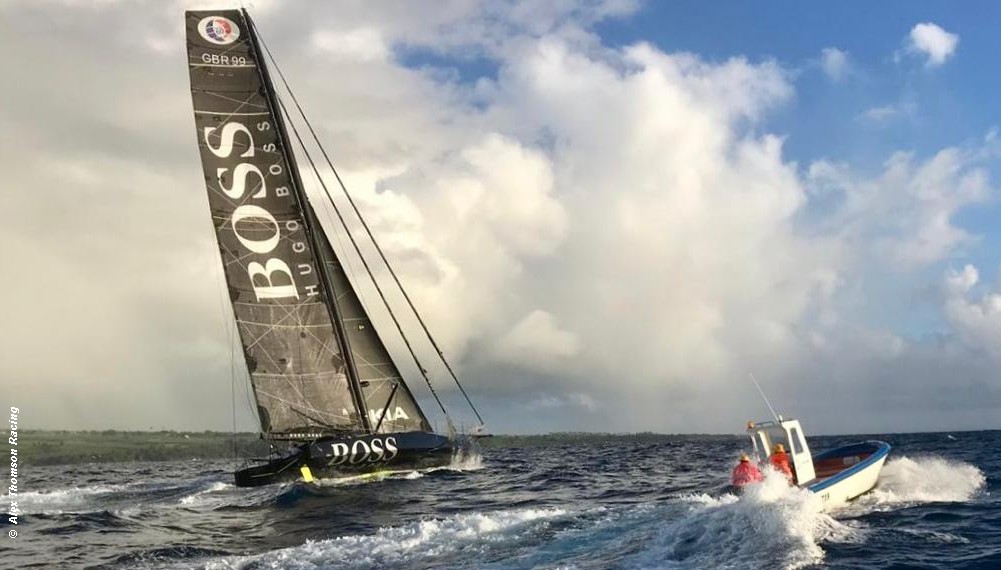 Upon hitting the reef, Alex Thomson had to lower his sails and start his engine to reverse his boat from the rocks. He then rehoisted his sails, set a new seal on the propeller shaft, and continued to the finish.