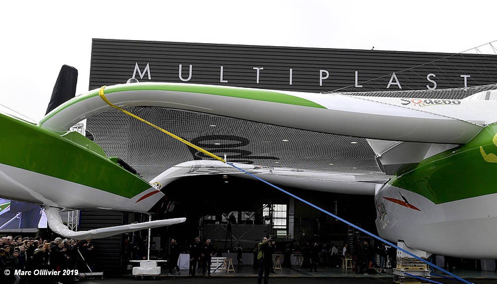 Sodebo Ultim 3 left the site at Vannes, France on Saturday, 2 March after 18 months of work in the Multiplast hanger.