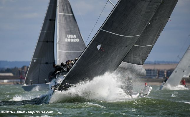 While it was a warm and mostly sunny day on land, it was a breezy one on the Solent, with powerful gusts to 25 knots that provided exhilaration at the same time as forcing a string of retirements.