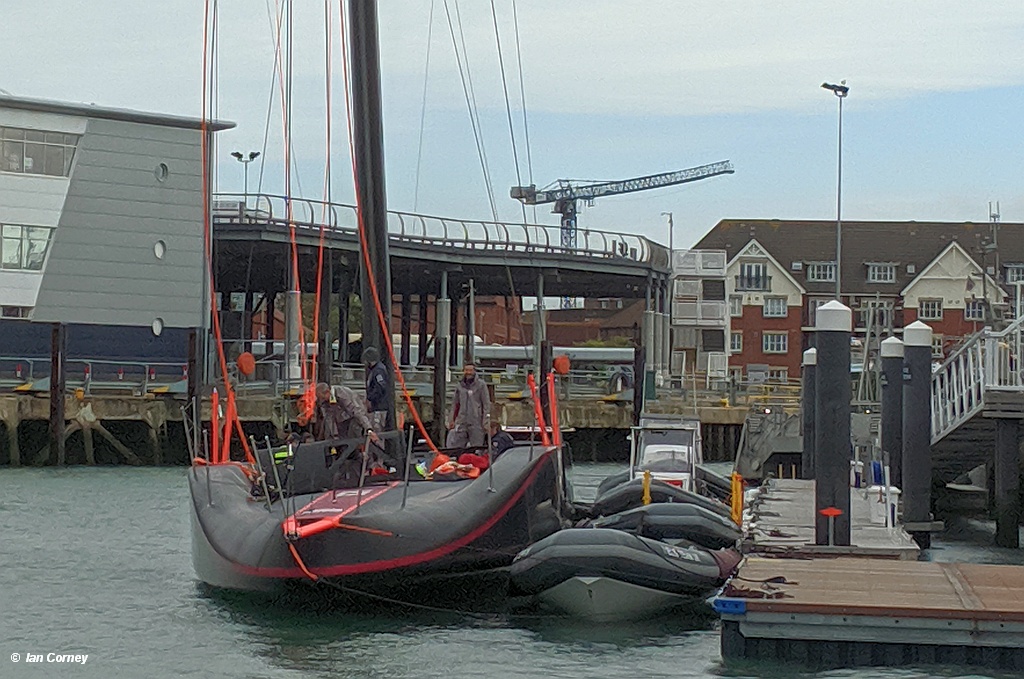 First INEOS Team UK AC75, Britannia, is back in the water following the mast stepping as rigging continues before first sail trials.