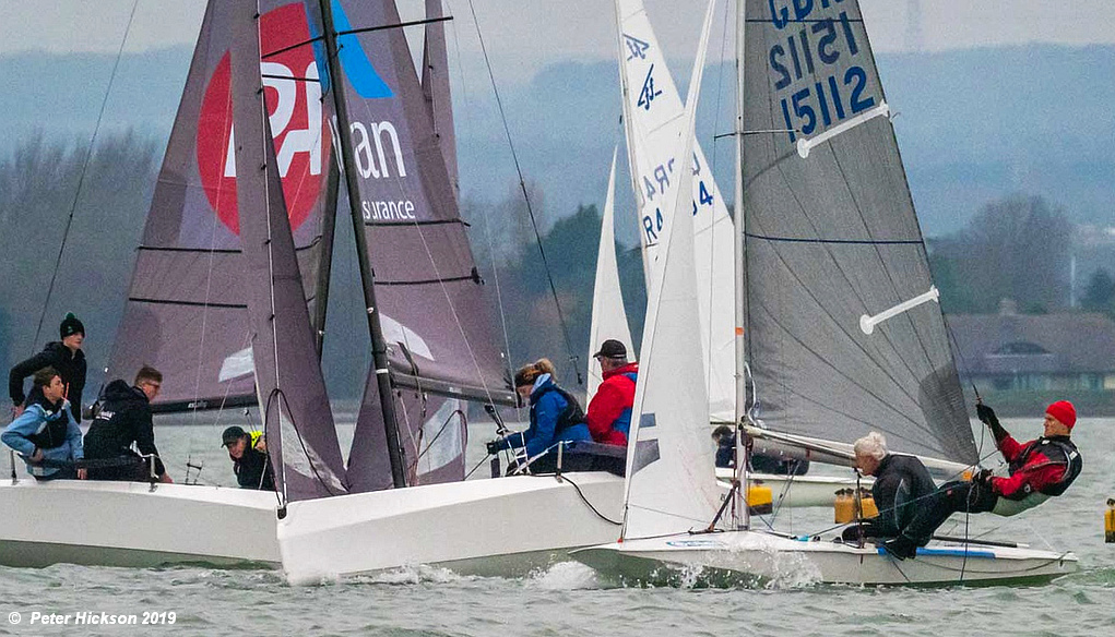First to start was Oscar Hoult in his Topper who struggled to make ground upwind over the adverse tide. Nick Rawlings led the six-strong Solo fleet around the weather mark having showed the way by short tacking along the Hayling Beach while his fellow competitors chose the Winner Bank.