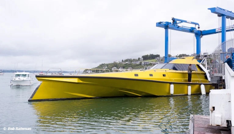 Designed and built by Youghal-based Safehaven Marine, managing director Frank Kowalski describes the super-swift craft as “a unique, hybrid hull design, asymmetrical catamaran, with a wave-piercing deep V mono-hull”.