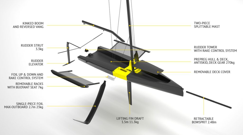 It is equipped with a square-top full batten mainsail, full batten jib and a gennaker and has 40 square metres of sail area.