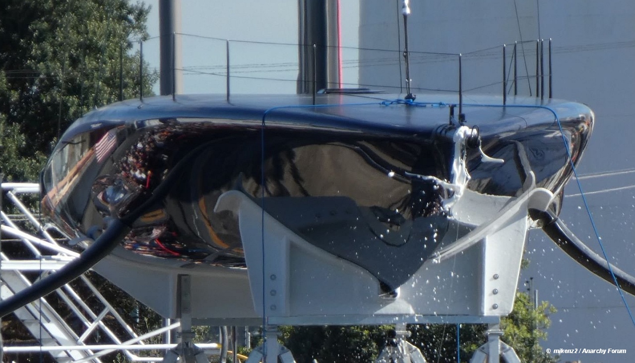 The second hull showed a radical move from a flat-bottomed scow to a deeper skiff shape, following the trend set by Luna Rossa and Emirates Team New Zealand with their first boats.