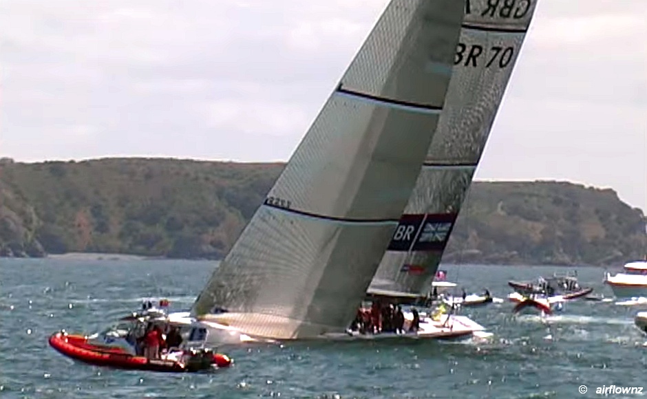 After nine days without being able to race due to the weather conditions, Race 4 was sailed in strong winds and rough seas and New Zealand’s mast snapped on the third leg. Quality control was obviously not a Kiwi strong point . . . 4 – 0