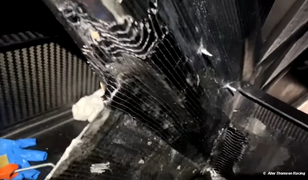 The hydraulic oil spurted out from a leak in the ram cylinder and sprayed all over the inside of his boat. Now he has no pressure in the rams and the keel head is moving free . . . he has a plan.