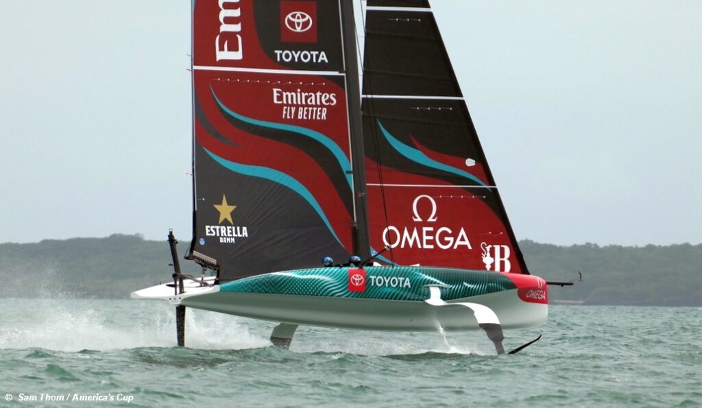 The Kiwis were out in a solid breeze that peaked up at 20 knots+. Sea state was lumpy so this was upper-range conditions and a real test for the new Wing04 on the starboard foil arm and an even sterner test for the Flight Controllers/Trimmers charged with dealing with an asymmetric set-up from port to starboard.