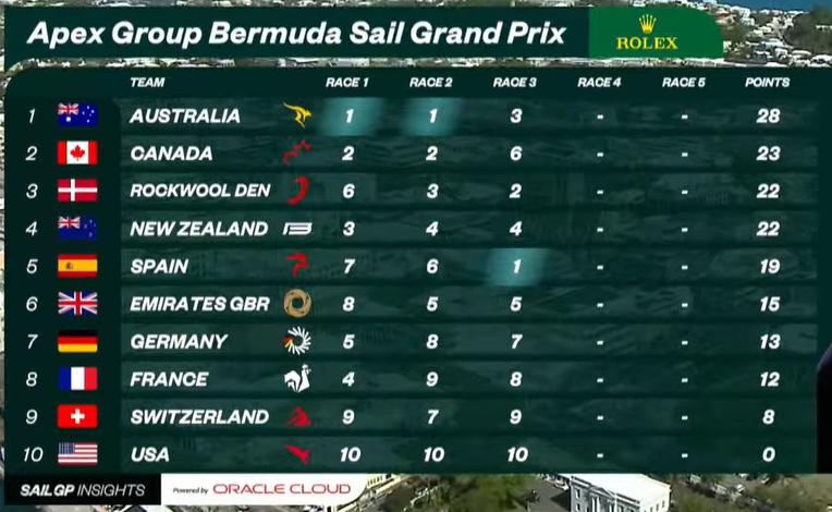 The USA did not compete in Bermuda after damage sustained to the F50 during the team’s dramatic capsize was deemed too severe to repair in time.