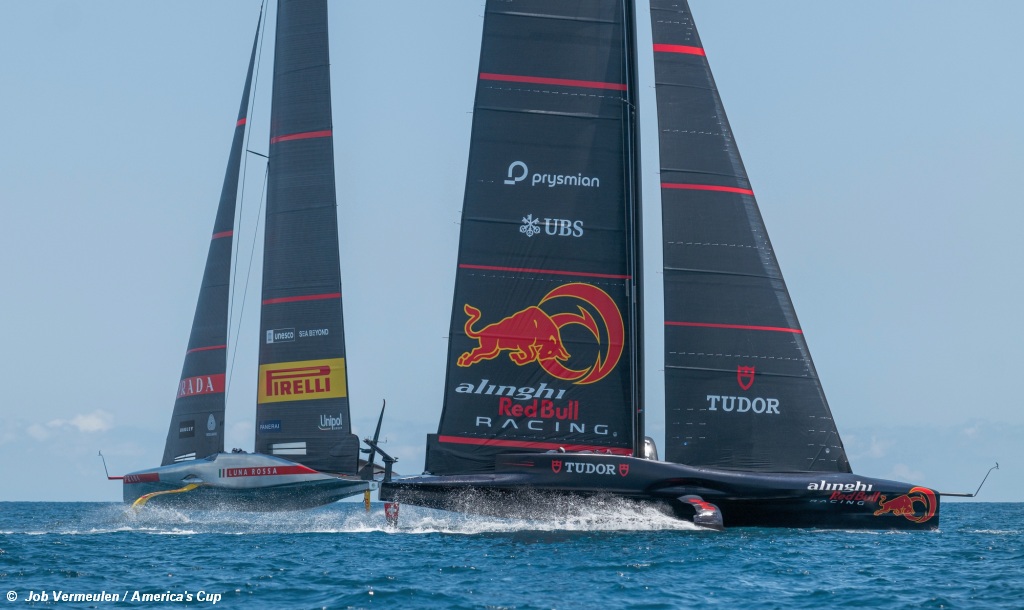 Alinghi Red Bull Racing had a much better day performance-wise and enjoyed some rule-stretching criss-crossing with Luna Rossa Prada Pirelli upwind and down.