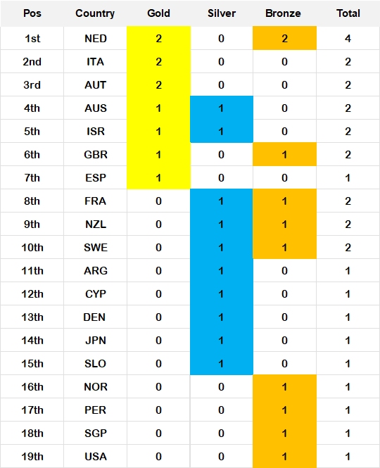 It is perhaps ironic that the medals came in the two newest ‘sailing’ events – the iQFoil and the Formula Kite – both foiling board events, not involving any of the traditional in-water dinghy designs.