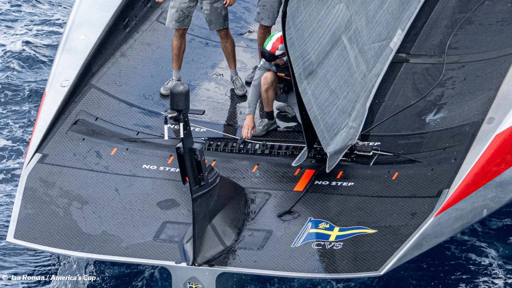 The second windward mark saw another dead heat, with the two boats tacking simultaneously to round opposite marks at the same time. At the cross Luna Rossa was clear ahead when a loud bang, indicated a dramatic gear failure of the traveller system of Luna Rossa Prada Pirelli and their race was over.
