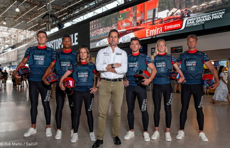 As the countdown to the Emirates Great Britain Sail Grand Prix Portsmouth on 19-20 July gathers pace, the British team dressed in full sailing kit, made a striking appearance at London Waterloo Station – catching themselves in action played on the big screens.