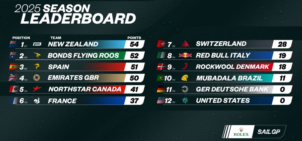 Peter Burling and the New Zealand Black Foils team now move to the top of the 2025 season leaderboard with 54 pts.