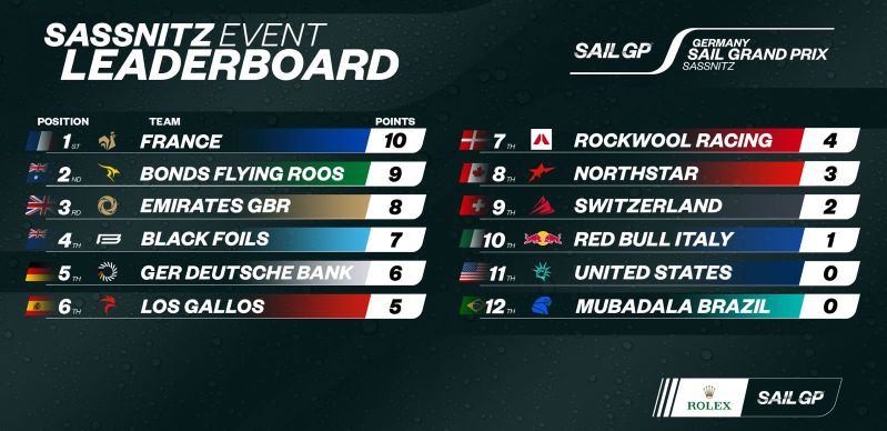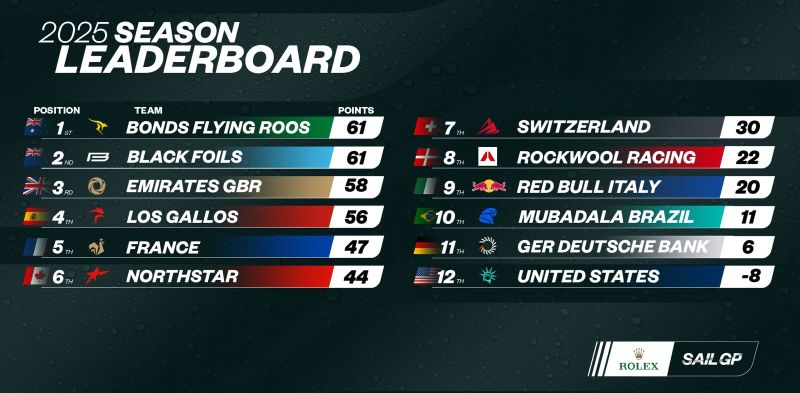 On the 2025 Season leaderboard Tom Slingsby and Australia are tied on points with and Peter Burling and New Zealand 61 each. While Emirates GBR with 58 pts move into third ahead of Diego Botin’s Spain on 56 pts now fourth. France are fifth.