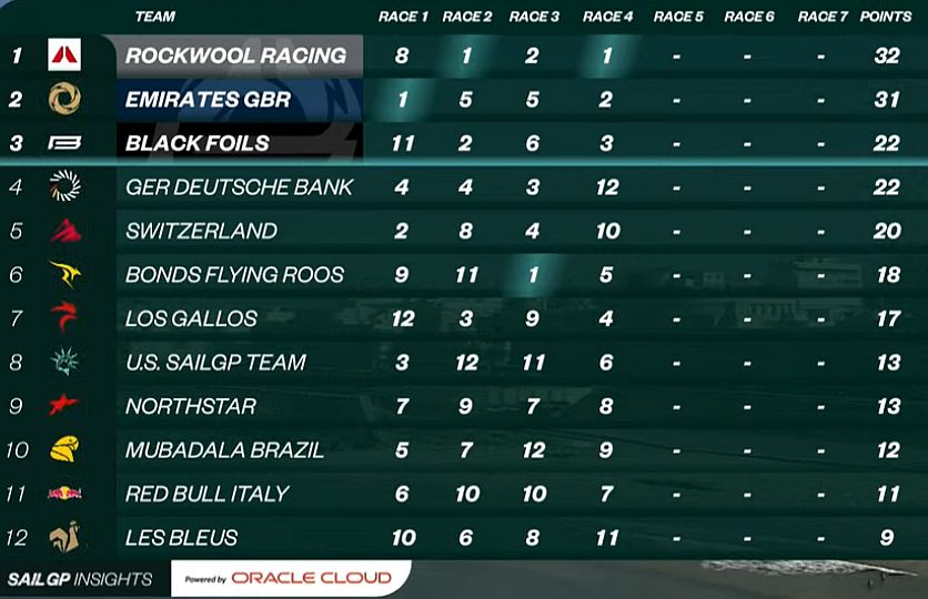 For the second event running all 12 teams were fitted with the new light-air T-Foils and rudders package, and sailing with the 24m rig mainsail and jib.