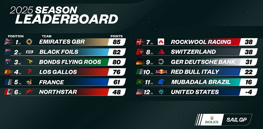Dylan Fletcher and the Emirates GBR SailGP team top the season leaderboard with a three point advantage, ahead of Kiwi Peter Burling’s Black Foils and Aussie Tom Slingsby’s BONDS Flying Roos.