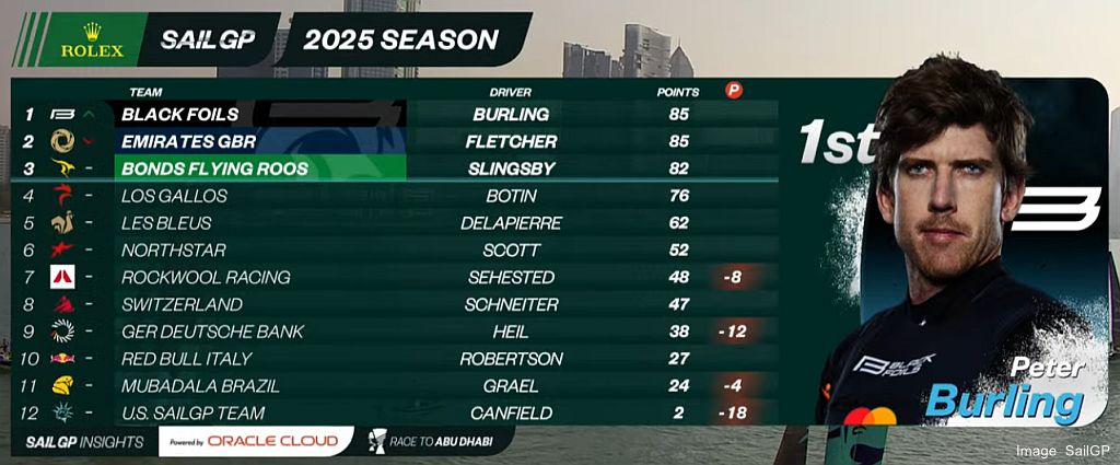 Peter Burling was back on the Black Foils and now sits top tied on 85 pts with Dylan Fletcher and Emirates GBR, with Tom Slingsby’s Bonds Flying Roos in third with 82 pts.