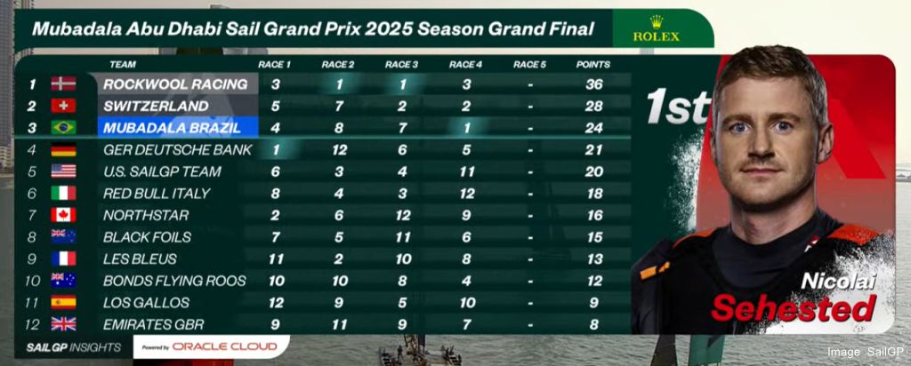 Second overall are the Swiss with 5, 7, 2, 2, and then third Mubadala Brazil with 4, 8, 7, and a win in the final race.