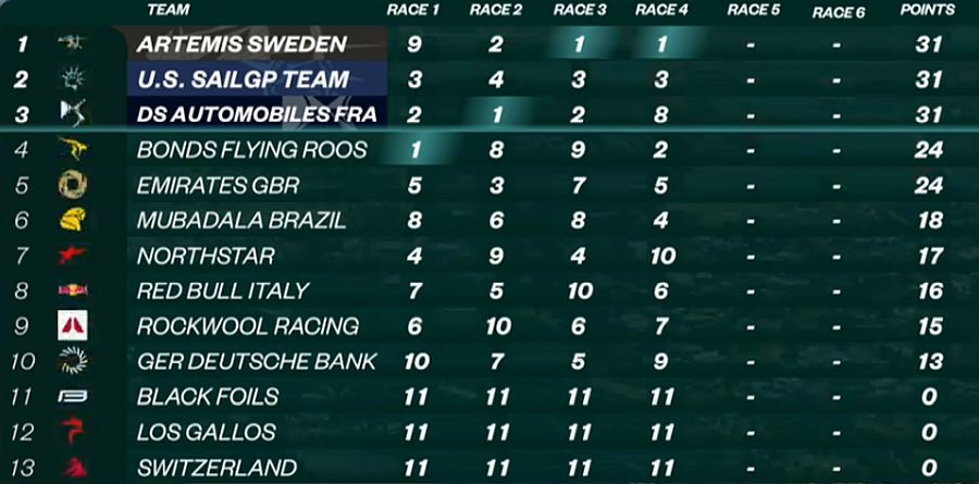 Race 3 saw Artemis Sweden really come into play, snatching their first win after race leader DS Team France came off the foils avoiding Bonds Flying Roos. France finished second and the US continued their improvement with another third place. Emirates GBR finished 7th.