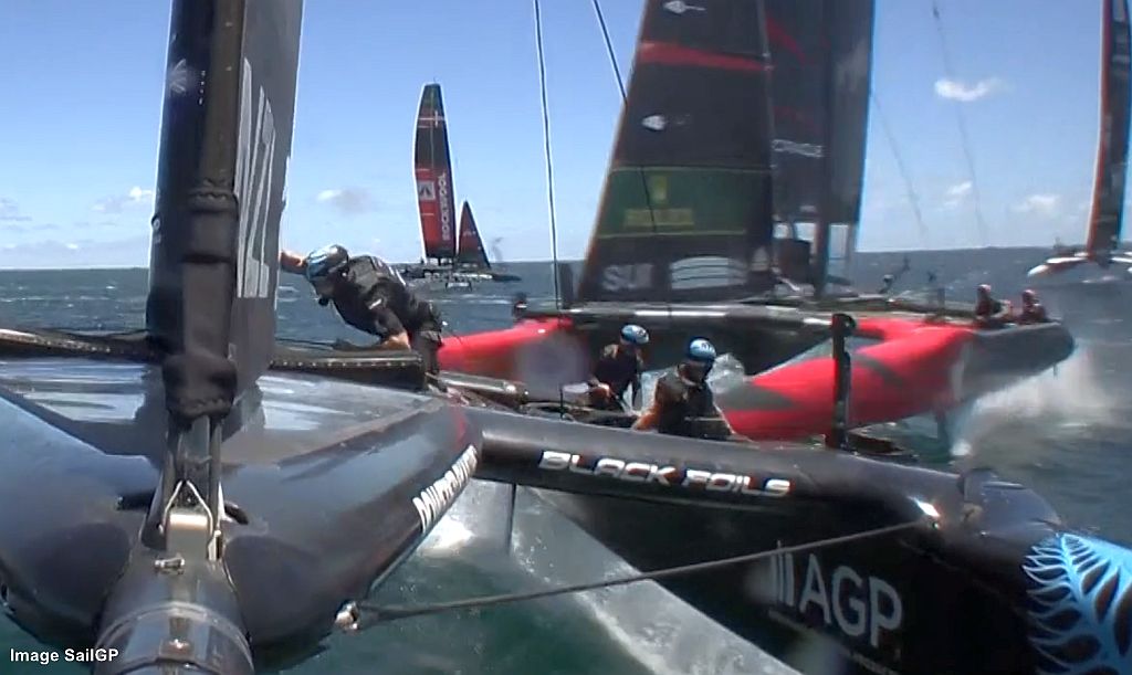 It took a little over a minute for the drama to amp up as New Zealand’s Black Foils and the Switzerland Sail Grand Prix team collided, ending both teams’ days before they’d even begun.