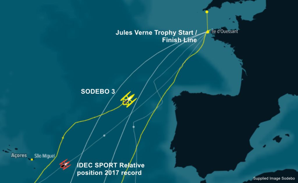 Sodebo 3 of Skipper Thomas Coville and his crew are on pace to break the circumnavigation record set by Francis Joyon on IDEC Sport in 2017 of 40 days 23 h 30 m 30 sec.