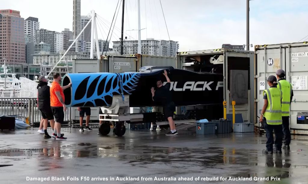 The Black Foils’ F50 has arrived in New Zealand, kickstarting the second phase of major repair work required to get the team on the water for their home event in just over a week.