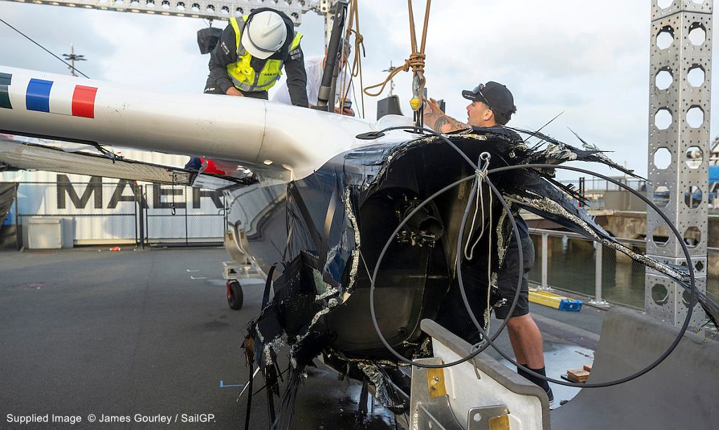 The incident occurred at the start of race three on opening day of the ITM New Zealand Sail Grand Prix, when the New Zealand F50 lost control approaching mark one at speed before turning sharply in front of the French boat.