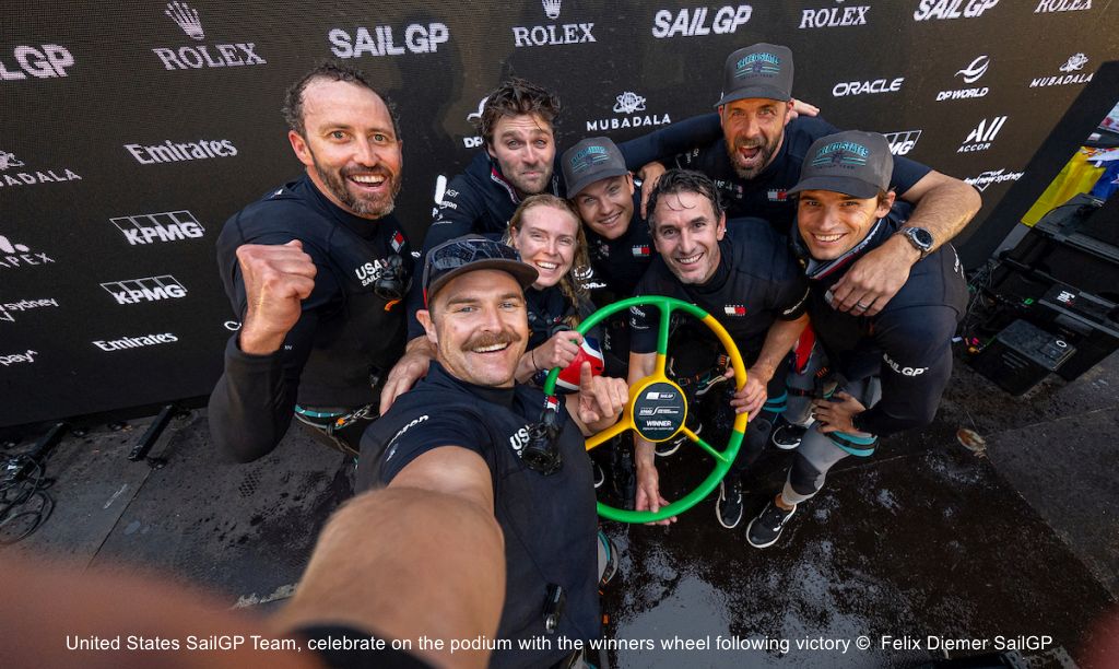The US SailGP Team crossed the finish after 12min 7sec of sailing, with second Emirates GBR and third Spain’s Los Gallos.