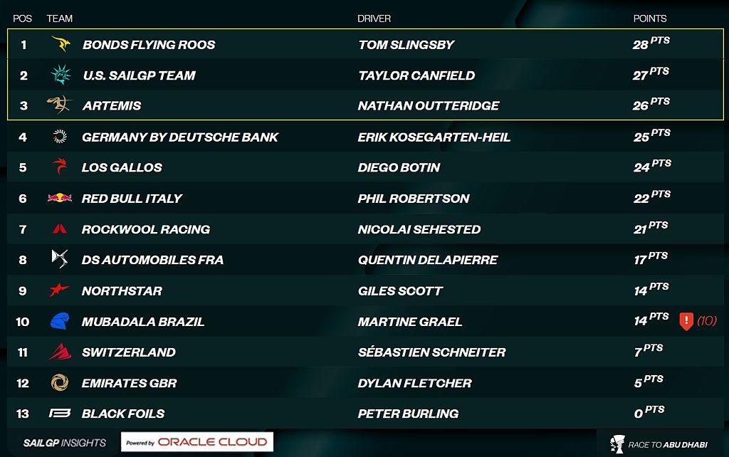Second is Taylor Canfield and the US SailGP Team (3, 4, 5, 5) on 27 pts, and third Nathan Outteridge and Sweden’s Artemis (1, 2, 6, 9) with 26 pts.