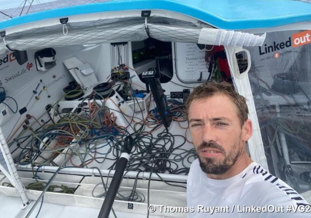 Vendee Globe race leader Yannick Bestaven (Maître CoQ IV) leads by 90+ nm from Charlie Dalin (Apivia) with Thomas Ruyant (LinkedOut) now featuring back with hte leaders in third place