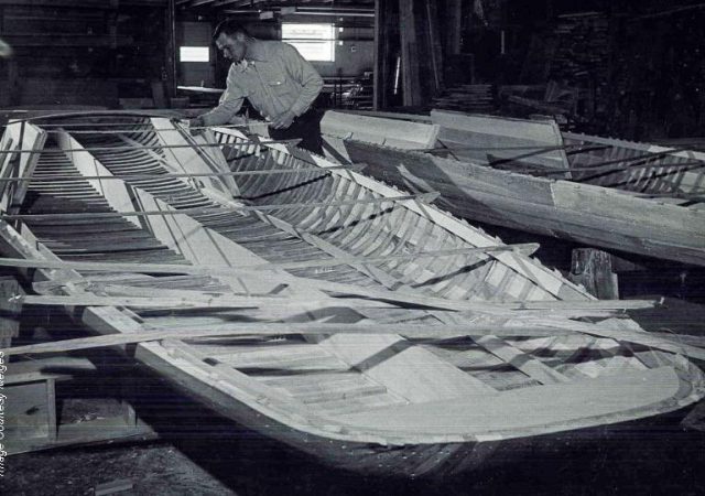 This photo of Harry C. Melges Sr working on a wooden Melges E Scow, nearly 75 years ago reminded me of the first time I saw a Scow in the UK at Southsea