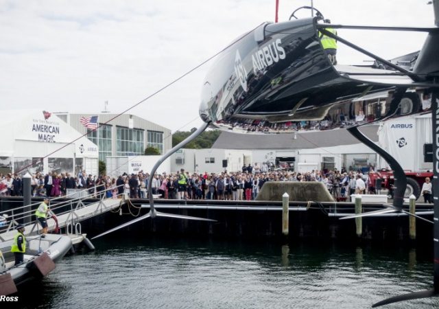 With little fuss the New York YC American Magic’s America’s Cup AC75 foils across Narragansett Bay near Newport, Rhode Island