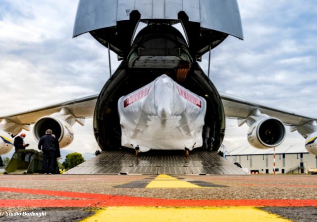 The second Luna Rossa Prada Pirelli hull is now New Zealand-bound after taking off from the Bergamo-Orio Al Serio airport on Friday 2 October