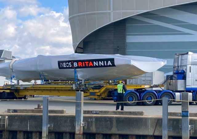 The second INEOS Team UK AC75 on the move from their Portsmouth UK base to be flown to Auckland, New Zealand on Monday