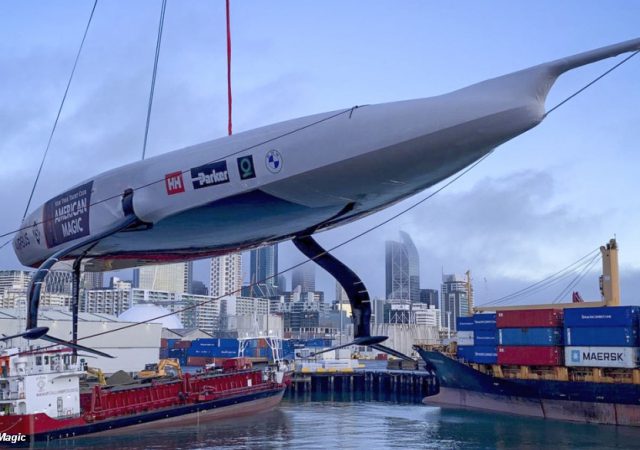Defiant, the first AC75 built for New York YC America’s Cup team arrived in Auckland, New Zealand, on Monday.
