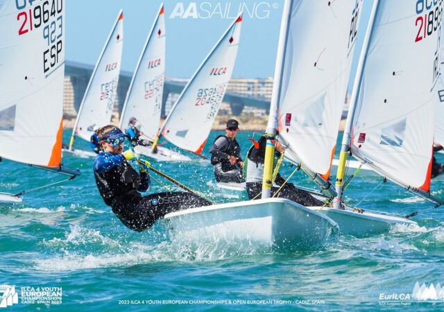 Racing started Monday for the 2023 ILCA 4 Youth European Championships & Open European Trophy at the Elcano Sailing Center, Cadiz, Spain.