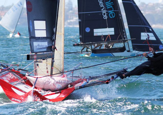 Race 1 of the Winning Group JJ Giltinan 18ft Skiff Championship on Sydney Harbour was won by the defending champions, Honda Marine