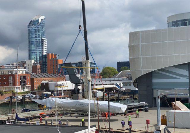 The new AC75 for Ben Ainslie’s INEOS Team UK was unloaded at the Portsmouth HQ on Monday 17 August