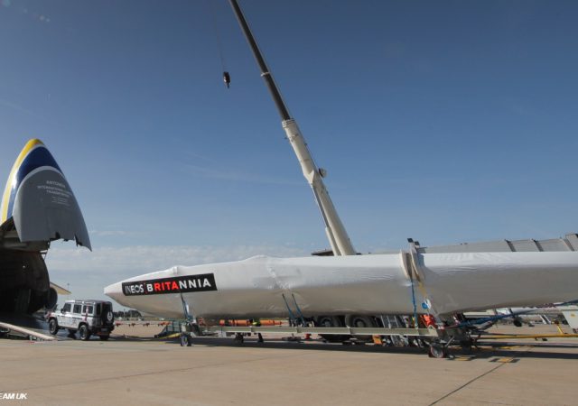 After leaving the INEOS Team UK, Portsmouth HQ on Friday 25 September, Britannia II, the second AC75 boat was transported by road to Stansted Airport, bound for New Zealand