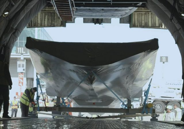 The second INEOS Team UK AC75 on the move from their Portsmouth UK base to be flown to Auckland, New Zealand on Monday