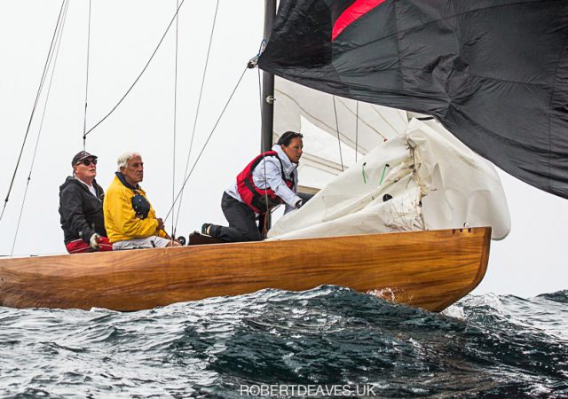Defending champions, Kristian Nergaard, Johan Barne and Anders Pedersen, sailing Artemis XIV won the first race of the 5.5 Metre Scandinavian Gold Cup