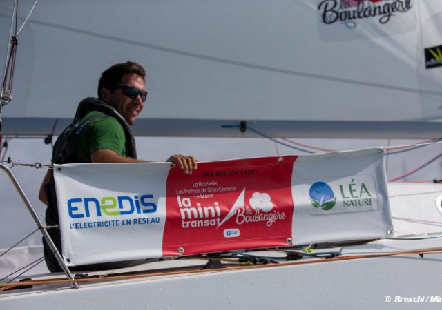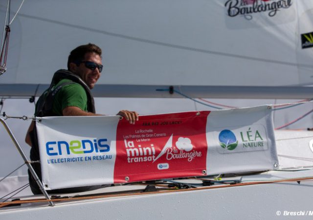 Axel Trehin was first across the finish line completing the 1,350-mile course of the first leg of the Mini-Transat La Boulangère