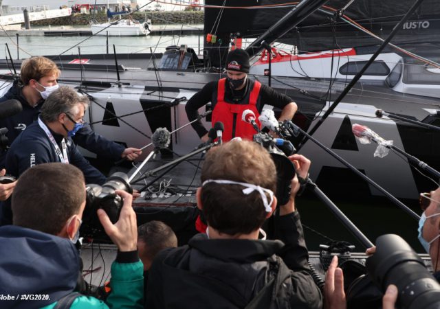 Disappointed Charal skipper Jérémie Beyou sailed up the Les Sables d’Olonne channel Saturday afternoon to a strong welcome