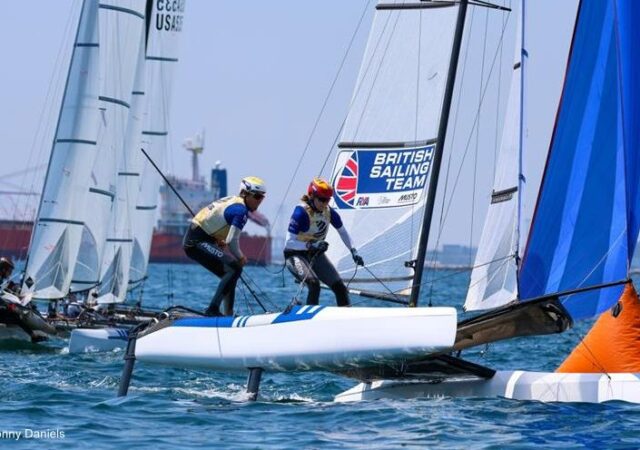 Going into the final day of of the Long Beach Olympic Sailing Grand Slam, Britain’s John Gimson and Anna Burnet lead the Nacra 17 class.