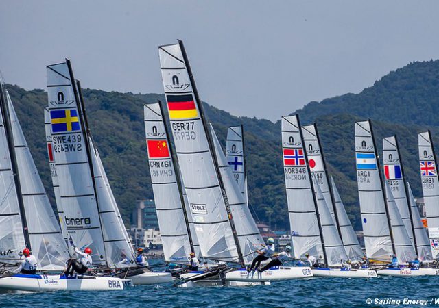 First medal race day with the Nacra 17, 49er, 49erFX and the two RS:X deciding their podium places at Ready Steady Tokyo in Enoshima