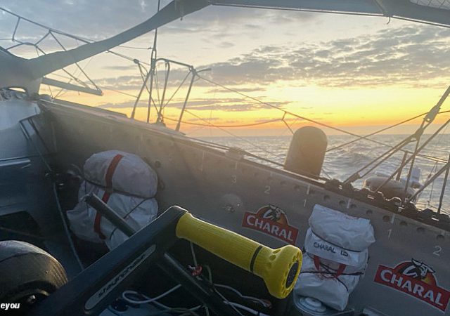 Jeremie Beyou on Charal leads the Vendee-Arctique fleet on the final leg to the finish in Les Sables d’Olonne ETA Wednesday morning